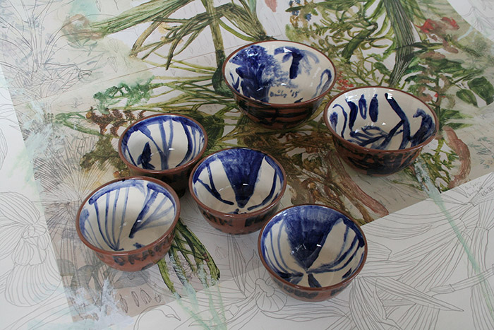 Richard Dunlop and Kylie Elkington ← Previous Next → 2015 Unique set from the ‘How to Draw Plants’ series, six bowls, white slip on terracotta, cobalt underglaze, gloss glaze -Sold-