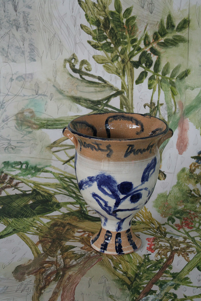 2015 Unique Urn (side view) from the ‘How to Draw Plants’ series, white slip on stoneware, cobalt underglaze, gloss glaze